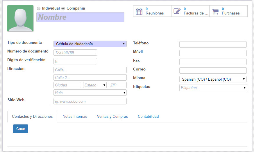 - ¿Es una compañía?: Para crear una compañía debe activar esta opción de lo contrario quedará en modo contacto.