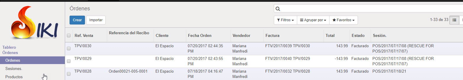 • Ordenes: Se puede visualizar el historial de todo lo que se ha vendido por el terminal punto de venta y el estado si esta facturado, el cliente, el monto total de la venta, vendedor entre otras.