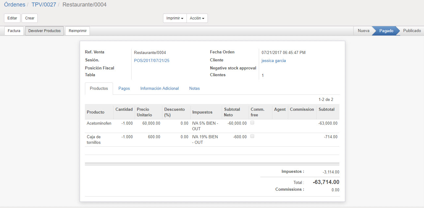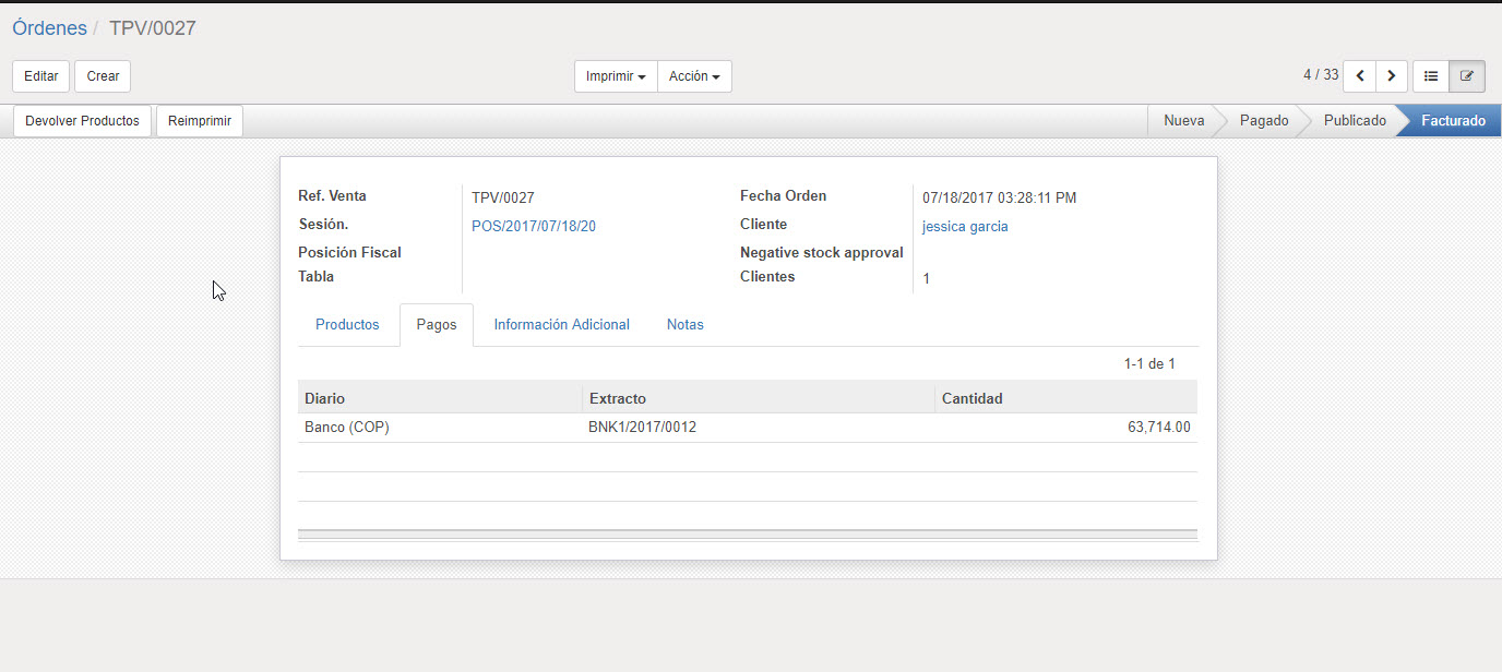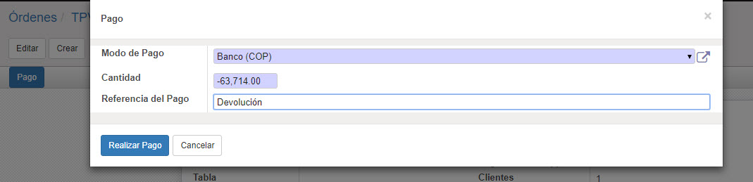 • Devolución en terminal punto de venta: En el caso de devolución TPV ir a ordenes verificar la orden a devolver abrir la orden y luego dar clic nuevamente a la pestaña pagos y verificar como fue el método de pago:
