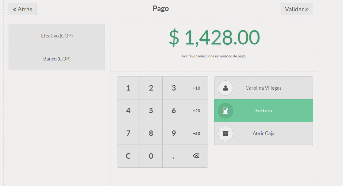 - Reanudar: darle clic al botón reanudar para vender por el POS. Abrirá la siguiente pantalla:
